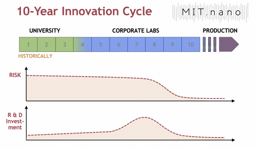Bulović said the traditional ten-year innovation cycle usually starts with ideas forming over a few years at university before becoming a paper then presented at a conference. At the presentation, corporations could listen in for potential ideas and take them back to the corporate research and development labs for a half dozen more years’ work and then, hopefully, productionization.